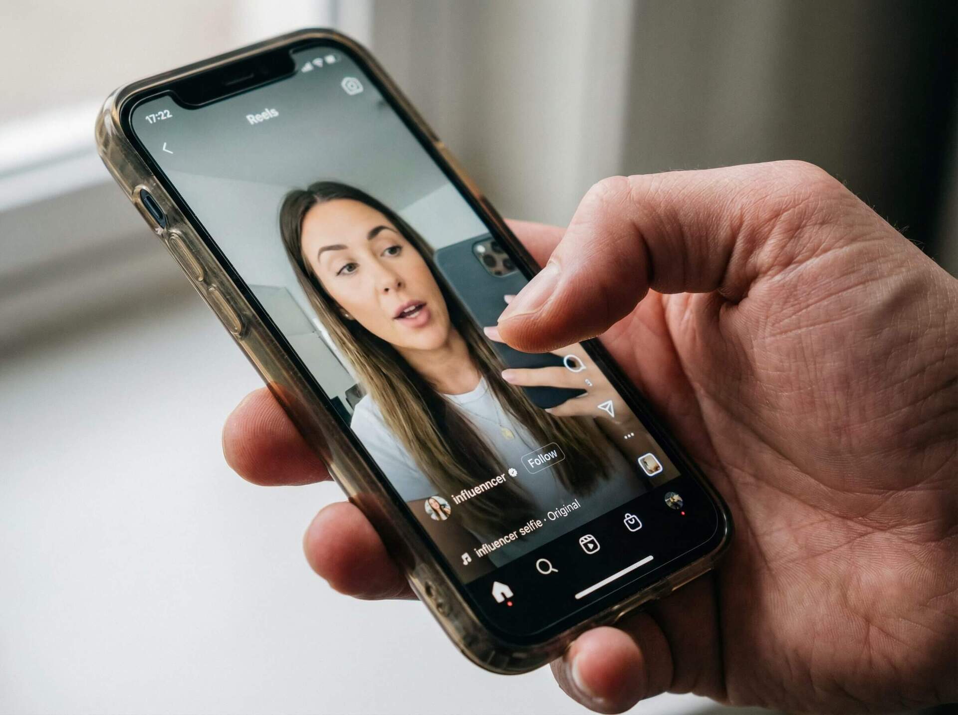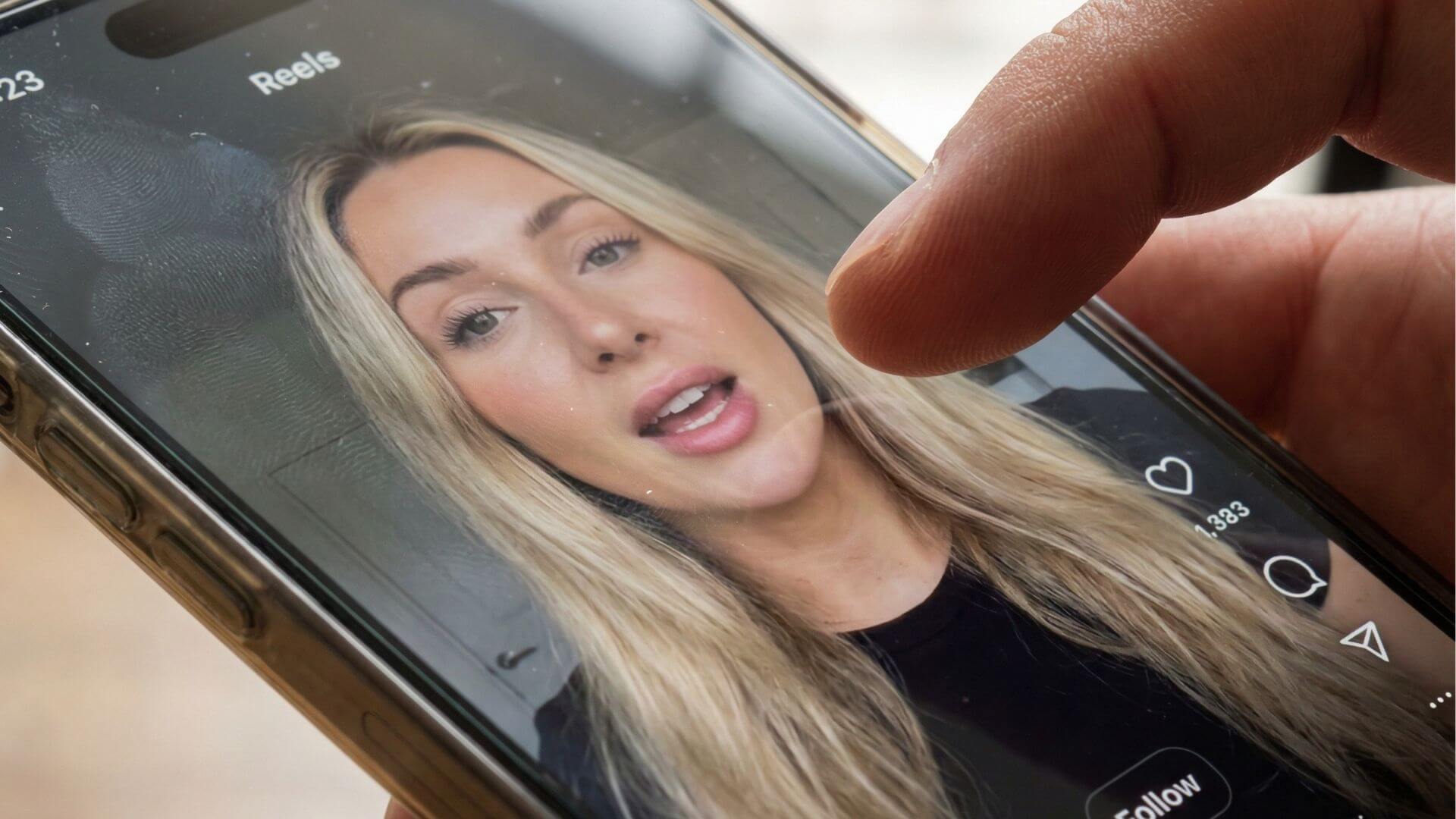 A hand scrolling through Instagram Reels pauses to watch an AI creator speaking on screen.