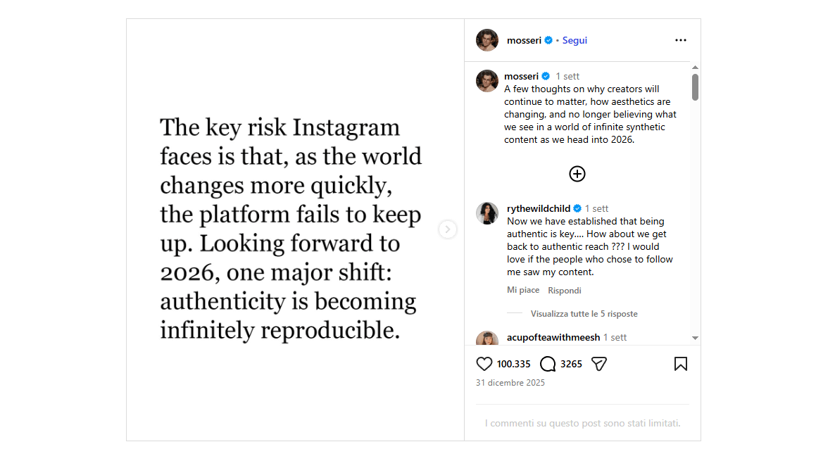 On January 1, 2026, Adam Mosseri, head of Instagram, published a year-end reflection on the platform: a visual and textual essay examining how artificial intelligence is radically reshaping the way we interpret images and videos online. In his statement, he makes a clear assertion: the era in which we could assume what we see is real has come to an end. We now operate within an ecosystem where AI-generated content has reached a level of sophistication that renders it indistinguishable from authentic media.