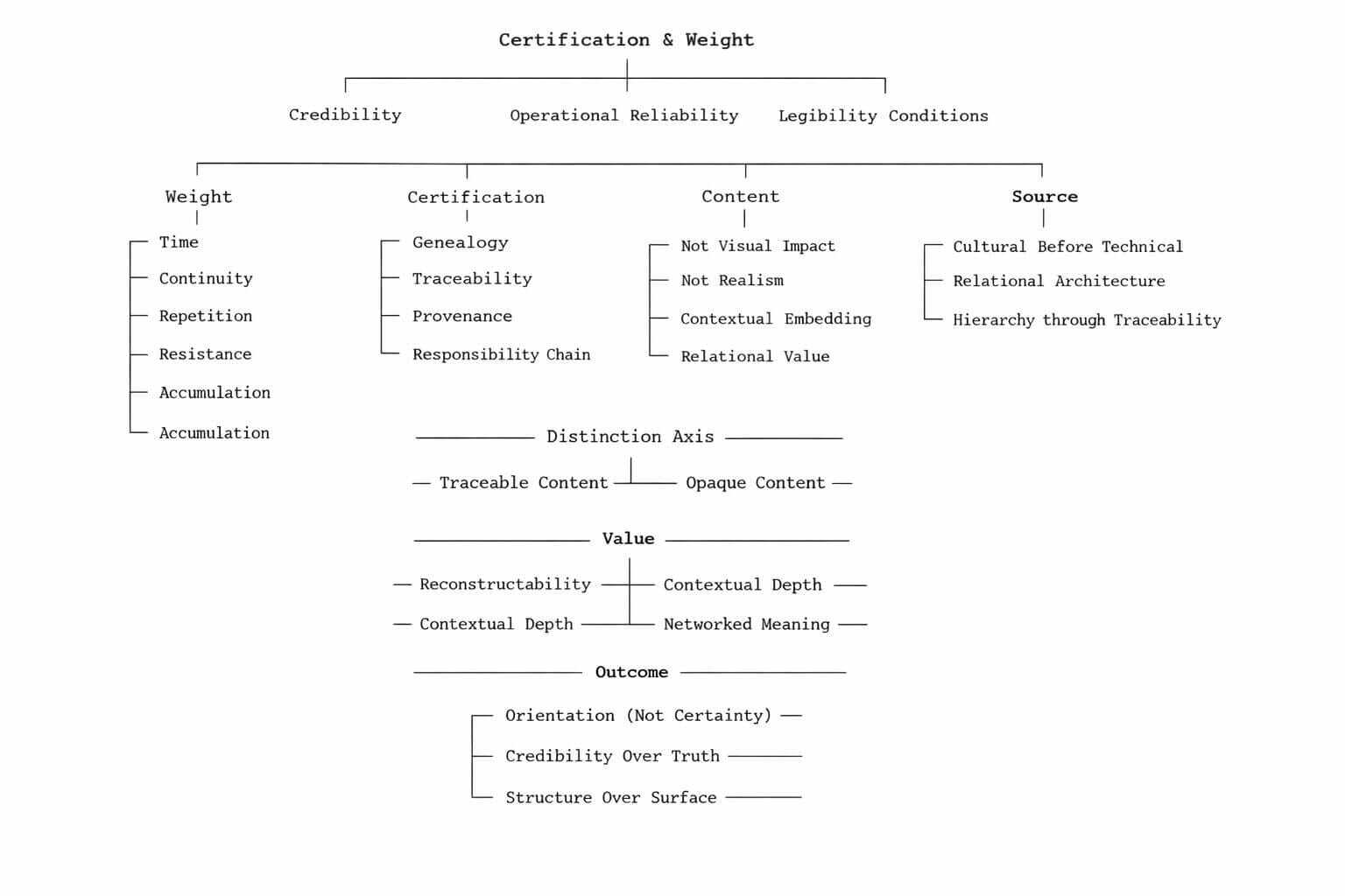 Certification operates as a cultural infrastructure before it becomes a technical one. It organizes the relationships between content, sources, and contexts. It introduces a functional hierarchy based on traceability and relational density. Within this system, content does not matter for what it shows, but for the network of references that sustains it.