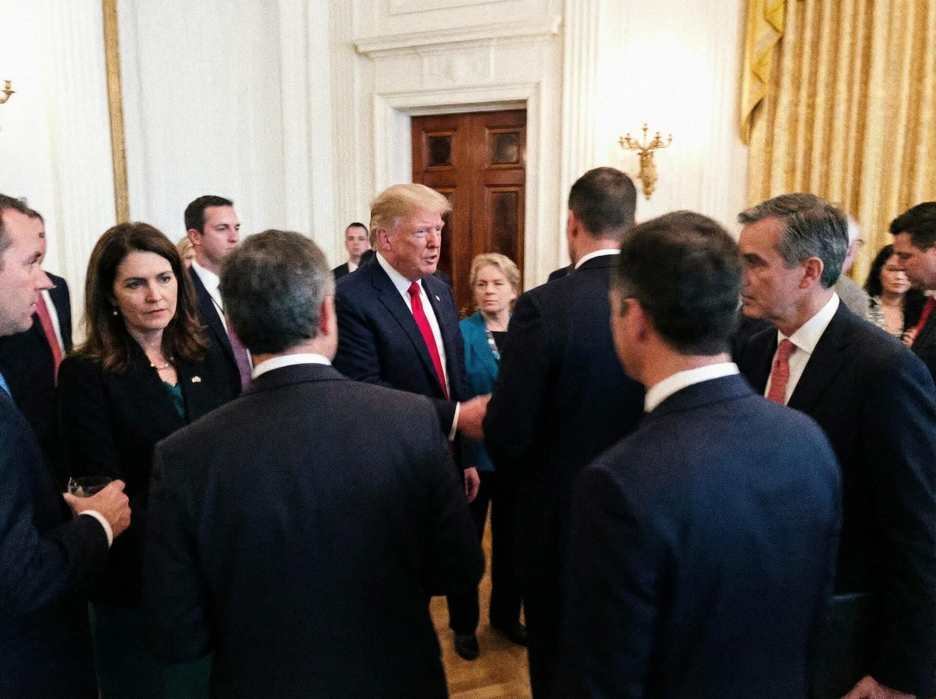 A fake formal gathering inside an official room, where a central political figure (Donald Trump) speaks with officials in suits. AI image by Fakewhale.